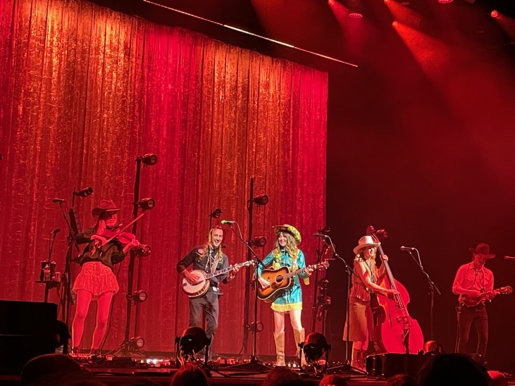 Headed downtown Friday night for my first big bluegrass show. Molly Tuttle and the Golden Highway were playing at the Ryman. Tuttle came out to cheers from a packed crowd, kicking the night off with one of her up-tempo hits “Nashville Mess Around”. In true country music homage to the mother church Molly was wearing a blue dress with gold fringe and a cowboy hat. Her bandmates were decked out in coordinating western outfits.