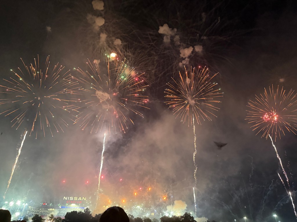 Nashville has one of the largest fireworks displays in the country. Every year they seem to get bigger and better. Last year was the first I’d seen of drones incorporated into the show, but there were only a few. This year, the drones started things off aplenty in such shapes as an eagle, planes, worded messages, and even a giant man. The fireworks just kept on popping for 35 minutes, lighting up the sky over the Cumberland River and Nissan stadium with beautiful lights. The finale was the best I’ve seen yet. I didn’t even take any photos or videos of it, because I was too mesmerized watching.